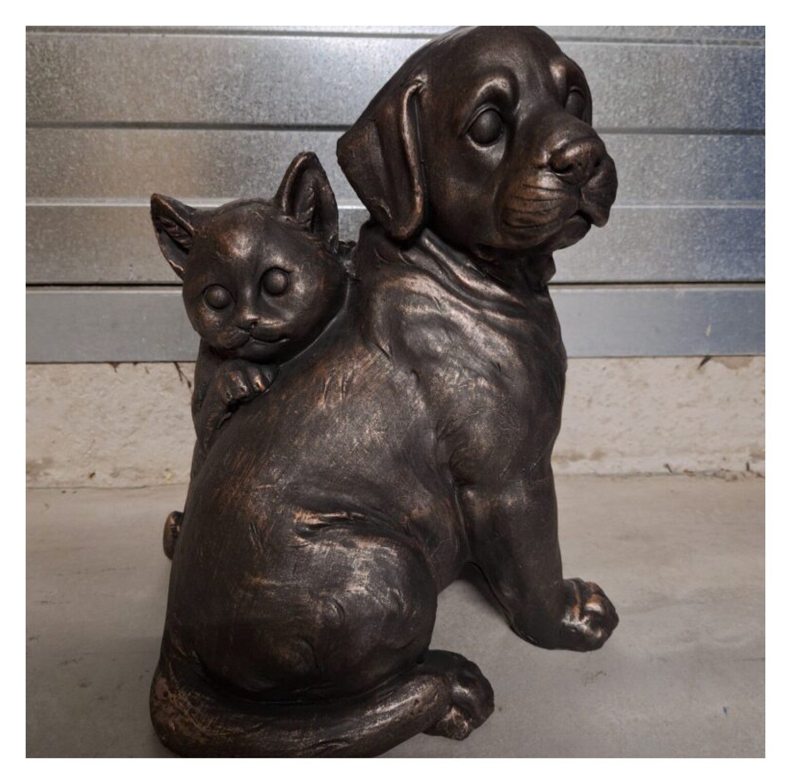 Hond speelt met kat antiek brons 50 cm