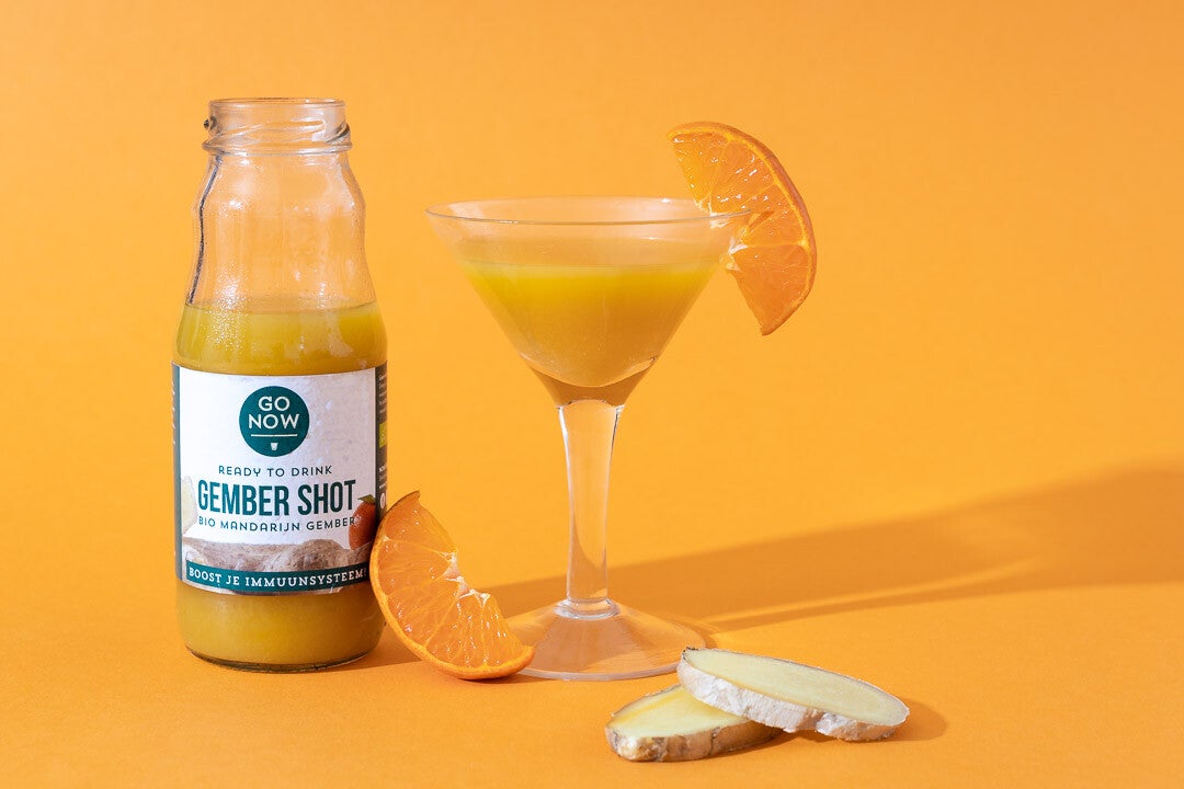 Ervaar deze heerlijke bio-vruchtenshot, bestaande uit mandarijnensap en een fikse scheut gembersap. Dit gezonde en lekkere gembershot geeft een pittige smaaksensatie. Uit 1 flesje ´Ready to Drink` haal je 2-4 shots.
